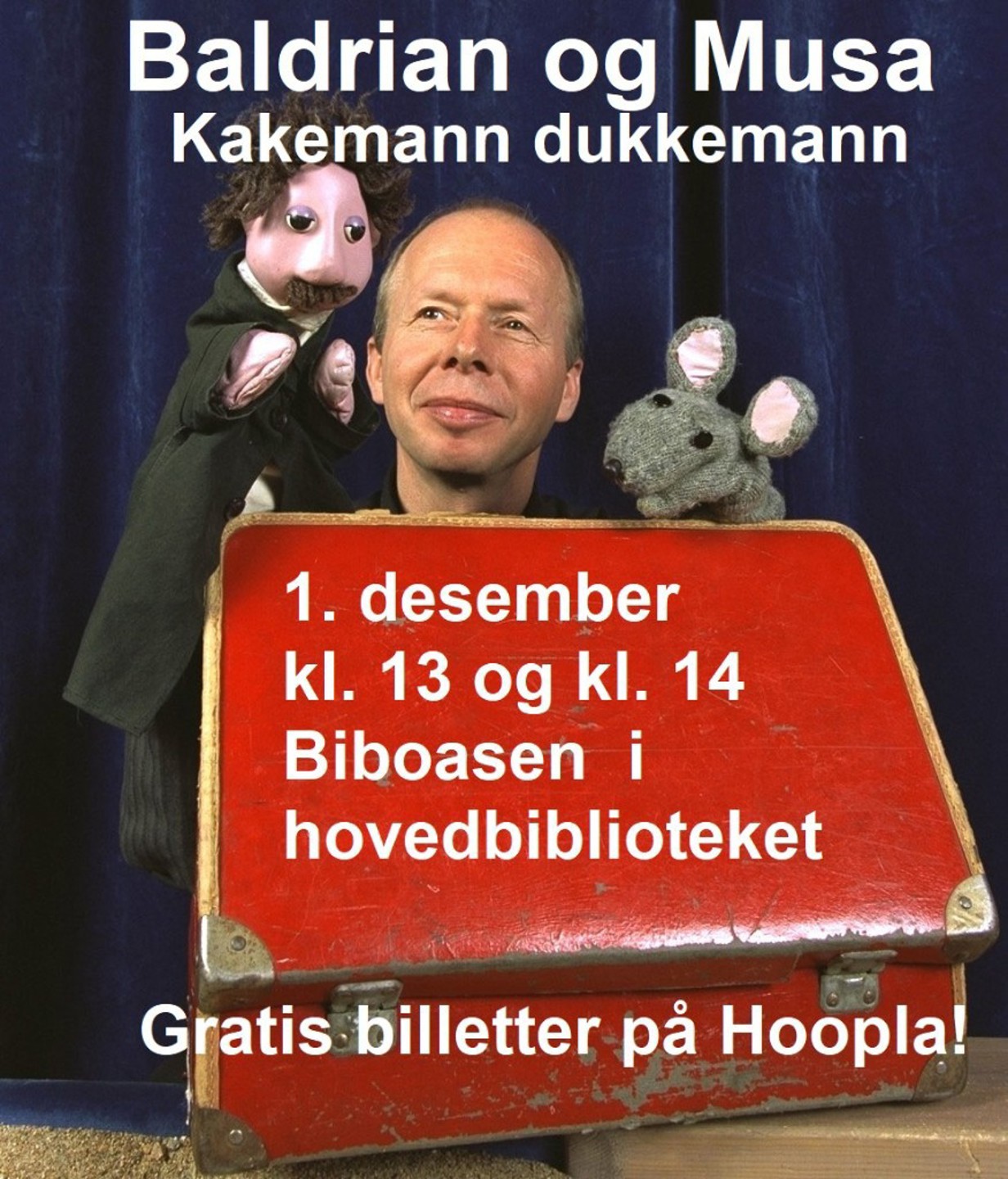 Baldrian og musa kommer til Kristiansand bibliotek 1.desember. Gratis billetter hentes på: https://krsbib.hoopla.no/